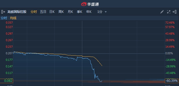 智通财经APP获悉,细价股龙辉国际控股(01007)午后现“断崖式”暴跌,股价腰斩,一度低见0.075港元,截至13时43分,跌59.9%,报价0.083港元,成交额1.122亿。