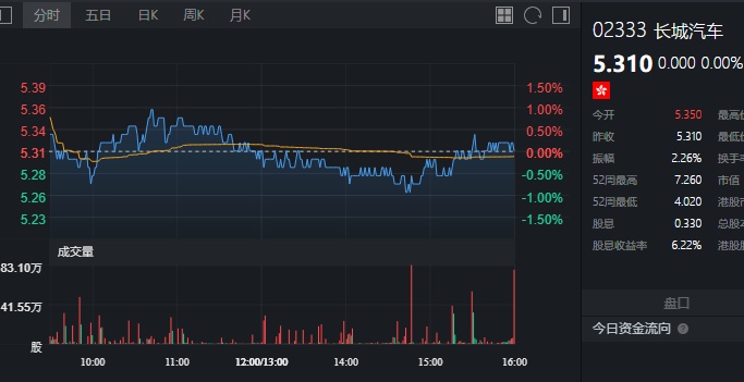 截至今日收盘,长城汽车无涨跌,报5.31港元。