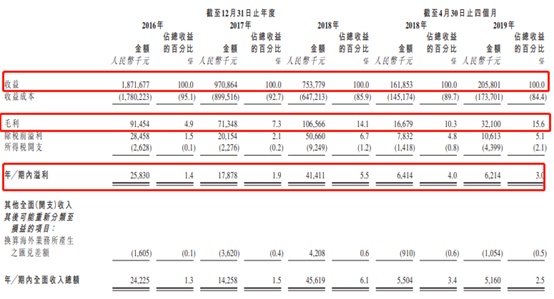 截至2018年12月31日止三个年度各年及截至2019年4月30日止四个月,收益分别为18.72亿元、9.71亿元、7.54亿元、2.06亿元;年度或期内溢利分别约为人民币25.8百万元、17.9百万元、41.4百万元及6.2百万元。