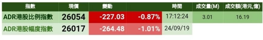 智通财经APP获悉,美股周二全线下跌,港股ADR指数大幅下跌。按比例计算,收报26054点,跌227.03点或0.87%。大型蓝筹股方面,汇丰控股(00005)收报59.45元,较港收市跌0.50元;腾讯控股(00700)收报331.45元,较港收市跌4.15元。