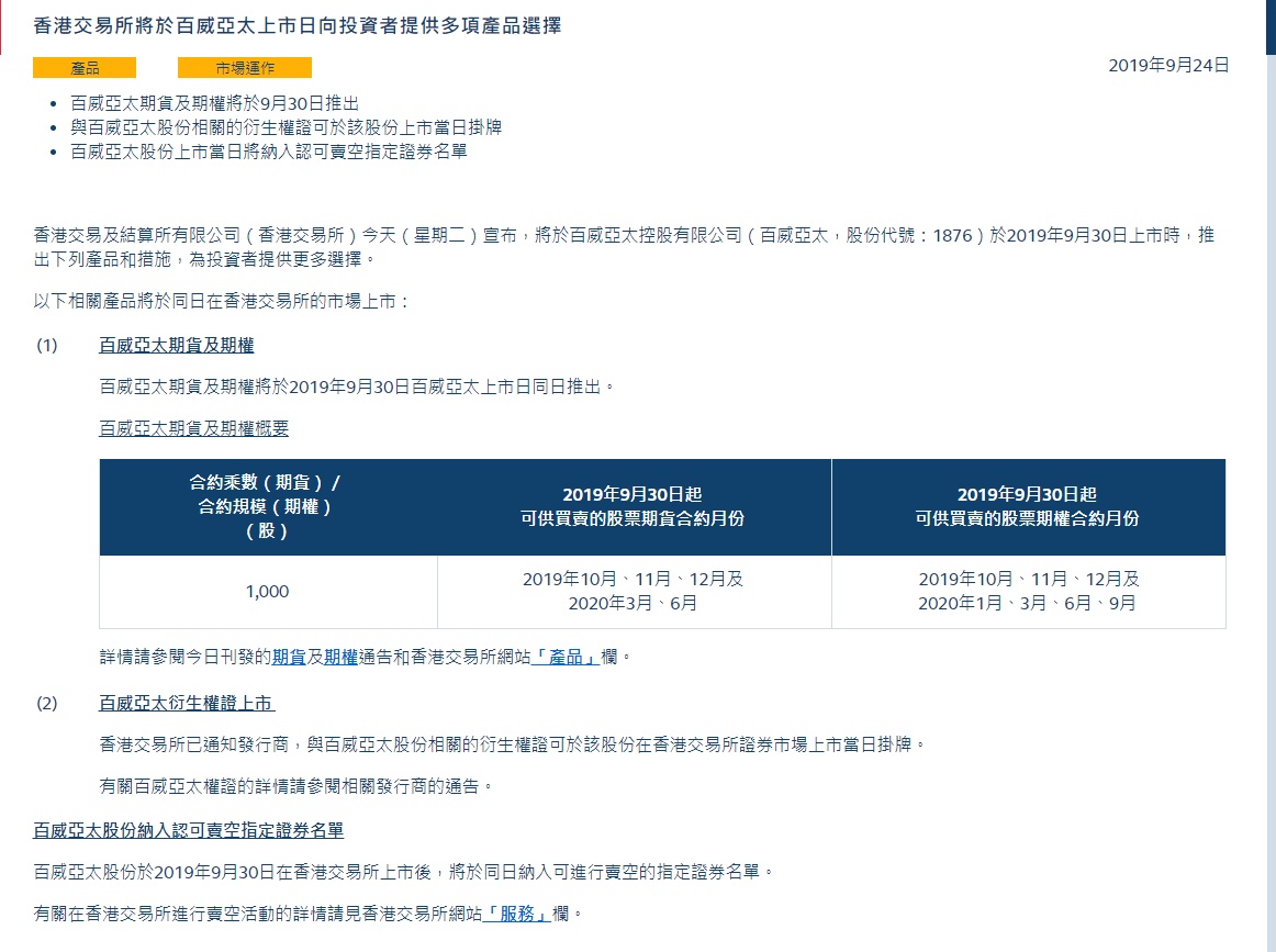 智通财经APP获悉,9月24日,港交所(00388)宣布,百威亚太(01876)股票期货及期权将于下周一(30日)百威亚太上市日同日推出。此外,已通知发行商,与百威亚太相关的衍生权证可于该股份上市当日挂牌。