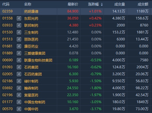 截至发稿,神威药业(02877)涨1.64%,报6.81港元;三生制药(01530)涨1.6%,报12.68港元;东阳光药(01558)涨0.28%,报36港元;中生制药(01177)跌2.48%,报10.22港元;绿叶制药(02186)跌2.66%,报5.86港元;国药控股(01099)跌1.88%,报26.05港元。