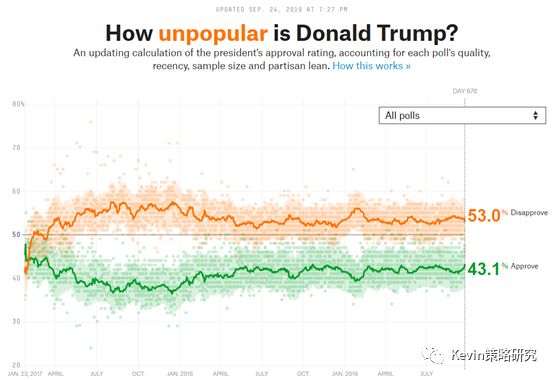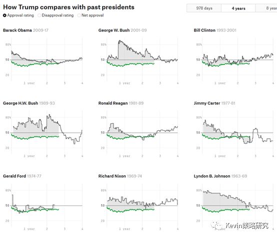 从支持率来看,综合fivethirtyeight和yougov的数据,特朗普总统目前的支持率水平为43~44%左右,最近两周还略有抬升,接近克林顿和奥巴马总统同期的支持率水平。过去一年甚至就任以来,其支持率持续处于40%左右相对稳定的水平。