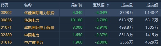 截至发稿,华能国际(00902)跌4.04%,报4.04港元;华润电力(00836)跌3.4%,报10.22港元;华电国际(01071)跌2.91%,报3港元;中广核电力(01816)跌2.5%,报1.95港元。