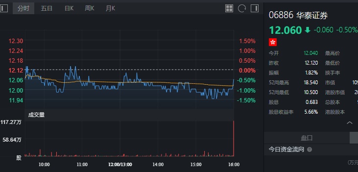 截至今日收盘,华泰证券跌0.5%,报12.06港元。