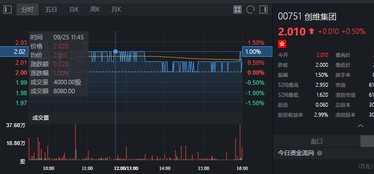 截至今日收盘,创维集团涨0.5%,报2.01港元。