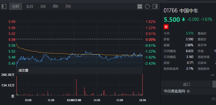 截至今日收盘,中国中车跌1.61%,报5.5港元。