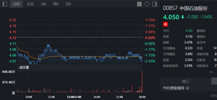 截至今日收盘,中国石油跌1.94%,报4.05港元。