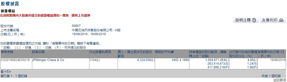 智通财经APP获悉,联交所最新资料显示,9月19日,摩根大通减持中国石油(00857) 432.4万股,每股作价4.166港元,总金额约为1801.39万港元。减持后最新持股数目约为10.55亿股,最新持股比例为4.99%。