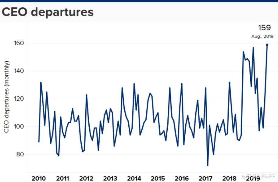根据高管培训公司Challenger,Gray&Christmas的数据显示,八月份,美国公司共有159名首席执行官职位变更,比七月份的数据高出28%。根据Challenger的数据,截至8月,2019年共有1009名美国公司CEO离职,高于2008年经济陷入金融危机时的水平。