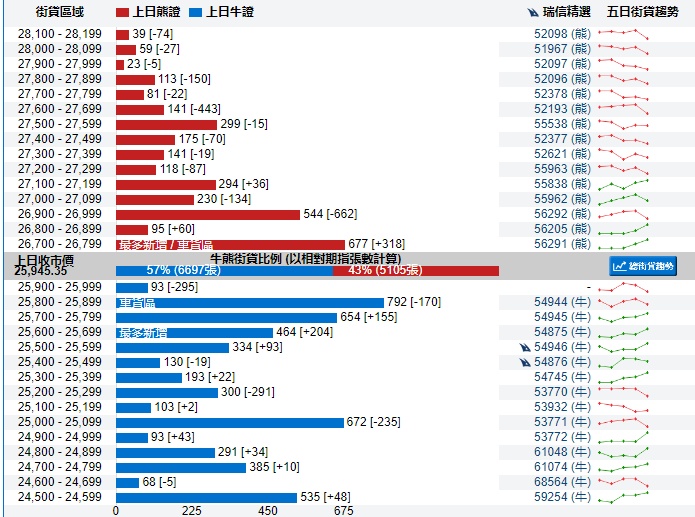 智通财经APP获悉,截至9月26日,恒指最新的牛熊街货比例57:43。瑞信恒指牛熊证街货分布图中的数据显示,熊证街货重货区在26700-26799区间,该区间最新熊证数量为677张,较上一交易日增加318张,最多新增也在26700-26799区间。牛证街货重货区在25800-25899区间,该区间最新牛证数量为792张,比上一交易日减少170张;最多新增落在25600-25699,较上一交易日增加204张。