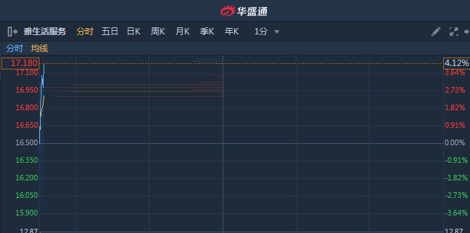 智通财经APP获悉,雅生活服务(03319)拟不超过20.6亿人民币收购中民物业及新中民物业各60%股权,今日复牌股价急升。截至9时33分,涨4.12%,报价17.18港元,成交额752.5万。