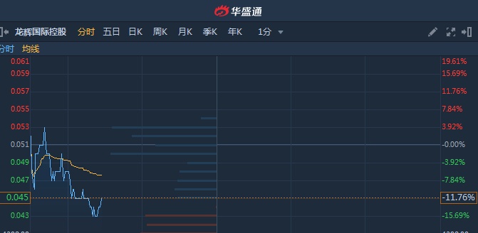 智通财经APP获悉,龙辉国际控股(01007)遭控股股东再售12.78%股权,拖累股价再度下探,低见0.042港元,续创历史低位。截至10时26分,跌13.73%,报价0.044港元,成交额1809万。