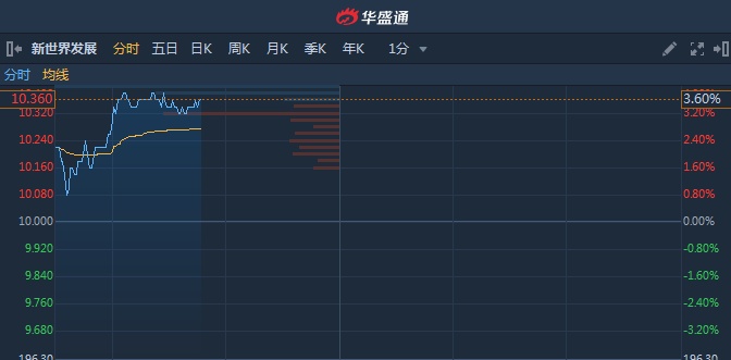 智通财经APP获悉,新世界发展(00017)昨日午间发布年度业绩,收入同比增26.49%至767.64亿港元,股东应占溢利同比降22.19%至181.6亿港元。绩后获多家大行唱好,截至10时45分,涨3.6%,报价10.36港元,成交额1.032亿。