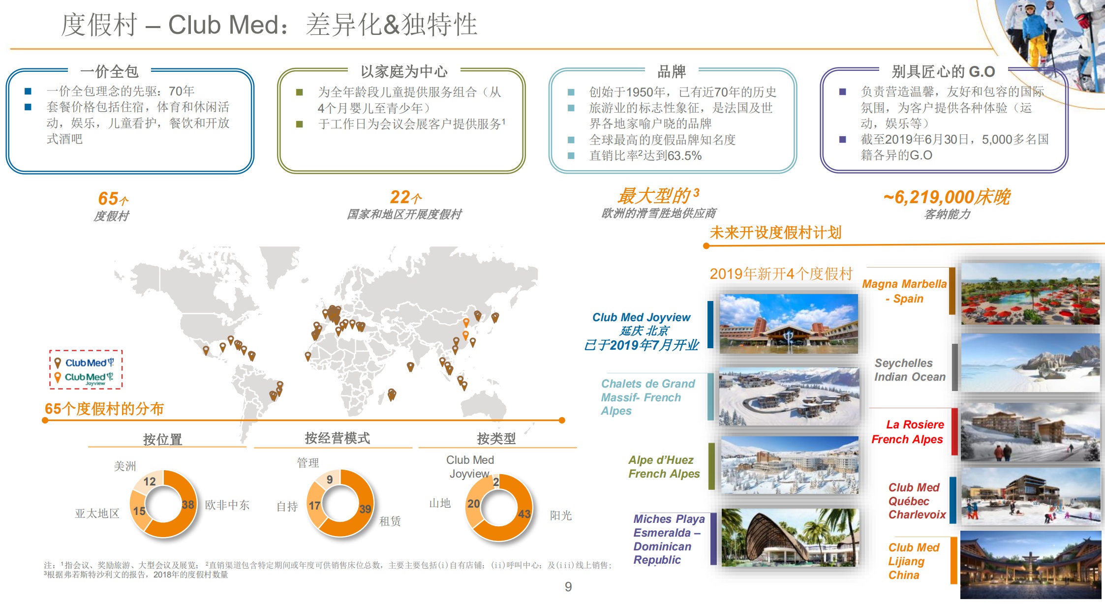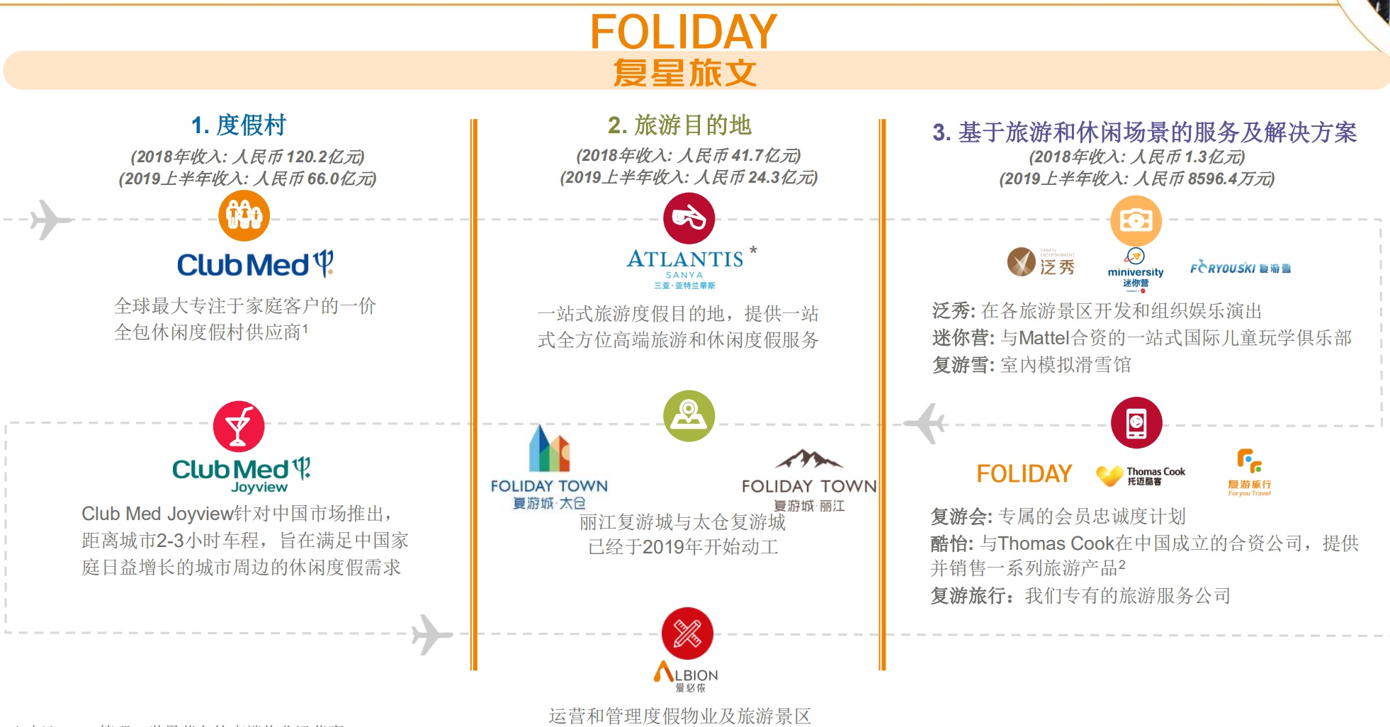第一部分度假村,主要包括Club Med和Club Med Joyview,该板块目前占到整个收公司的收入(19年上半年)的73%左右;第二部分旅游目的地,旅游目的地旗下有三个轻重结合的旅游目的地项目,分别是三亚亚特兰蒂斯、丽江及太仓复游城,其中三亚亚特兰蒂斯已正式营业,该板块2019年上半年占公司整体收入26%;第三部分以围绕一站式休闲度假的内容和渠道为主,占到公司总体收入的1%左右。
