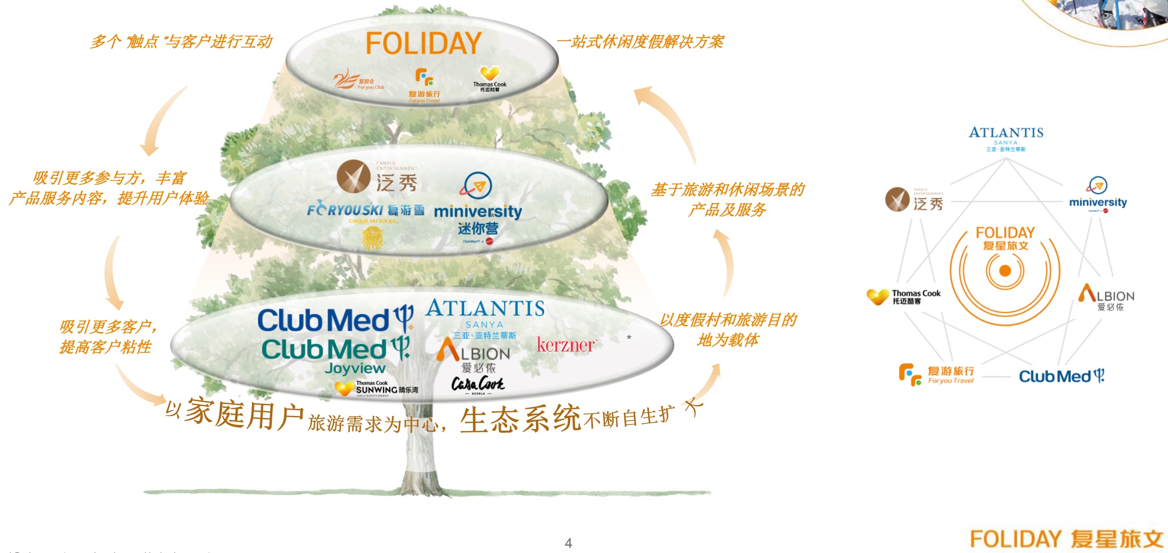 复星旅文的生态系统构建,可以用生态树来囊括,它的底层是以度假村和旅游目的地为载体的实体资产,往上就是内容及IP端,这部分的市场潜力很大,供给相当稀缺,在生态树的顶层是我们和客户接触的触点,也就是渠道建设,可以帮助我们不断自我进化产品和服务。