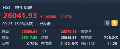 智通财经APP获悉,恒生指数高开0.5%,全天窄幅震荡。截至收盘,恒生指数涨96.58点或0.37%,报26041.93点,全日成交额达703.25亿。国企指数涨0.43%,报10212.27点,红筹指数跌0.08%,报4155.92点。