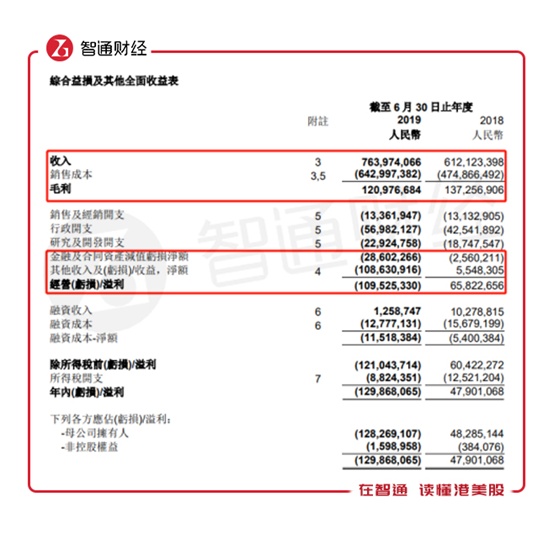 过山车般的股价走势算是有惊无险,但是9月25日,公司发布全年业绩公告称,截至2019年6月30日止年度业绩,公司录得收入7.64亿元人民币(单位下同),同比增长24.8%,但是毛利同比下降11.9%至1.21亿元,股东应占利润更是由去年同期的4828.51万元盈利,转为大幅亏损1.28亿元,目前每股基本亏损为17.61分,暂不派息。而且在大幅盈转亏的背后,公司业绩数据还暴露出了更多隐忧。