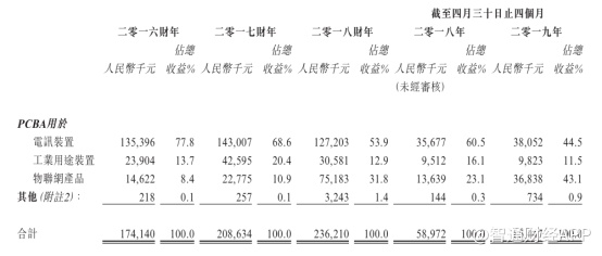 截至2019年4月30日止四个月,来自最大客户OPPO集团的销售收入占比为38.9%。第二、三大客户乐鑫集团、中云信安(深圳)科技有限公司则均以购买用于物联网产品的PCBA为主,占比共达30.4%。