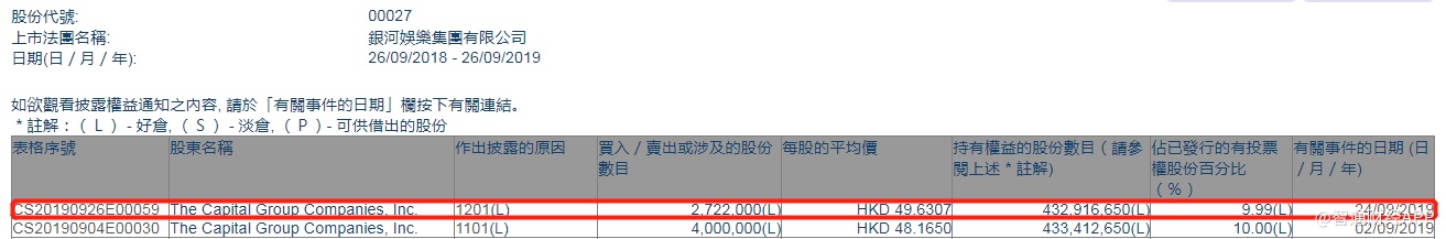 智通财经APP获悉,联交所最新资料显示,9月24日,The Capital Group减持银河娱乐(00027)272万股,每股作价49.63港元,总金额约为1.35亿港元。减持后最新持股数目约为4.32亿股,最新持股比例为9.99%。