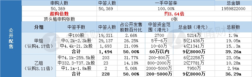 其中,公开配售申购人数为50369,一手中签率100%,认购倍数约3.64倍。
