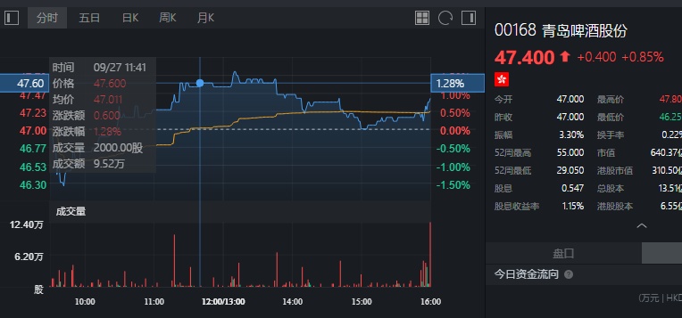 截至今日收盘,青岛啤酒涨0.85%,报47.4港元。