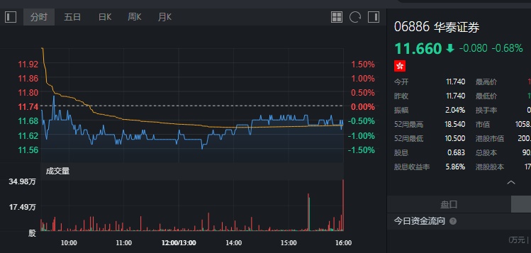 截至今日收盘,华泰证券跌0.68%,报11.66港元。