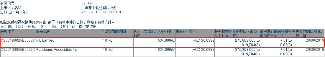 智通财经APP获悉,联交所最新资料显示,9月20日,富达国际(FIL Limited)增持蒙牛乳业(02319)53.4万股,每股作价30.0382港元,总金额约为1604.04万港元。增持后最新持股数目约为2.76亿股,最新持股比例为7.01%。
