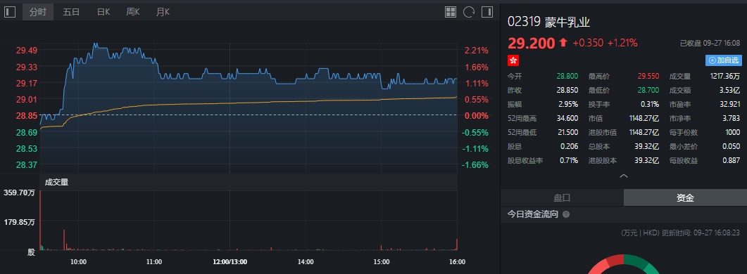 截止今日收盘,蒙牛涨1.21%,报29.2港元。