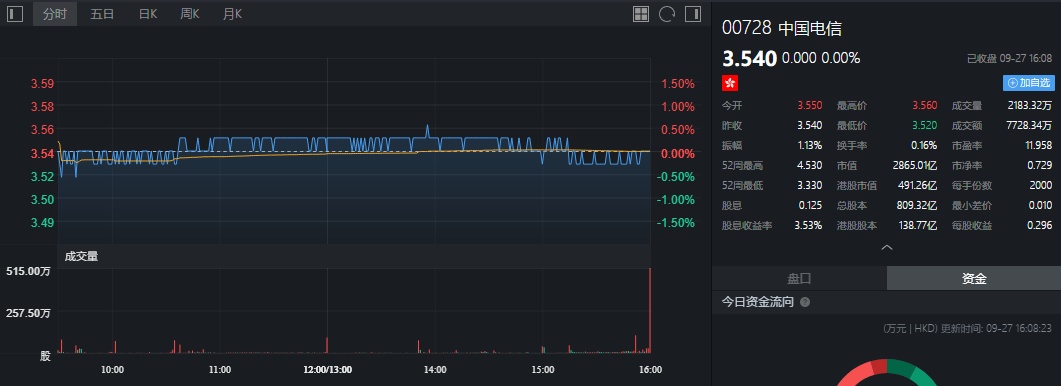 截至至今日收盘,中国电信无涨跌,报3.54港元。