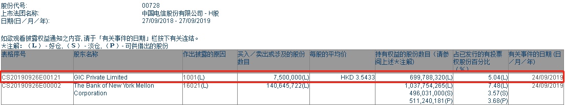 智通财经APP获悉,联交所最新资料显示,9月24日,新加坡政府投资公司GIC Private Limited增持中国电信(00728)750万股,每股作价3.5433港元,总金额约为2657.48万港元。减持后最新持股数目约为7亿股,最新持股比例为5.04%。