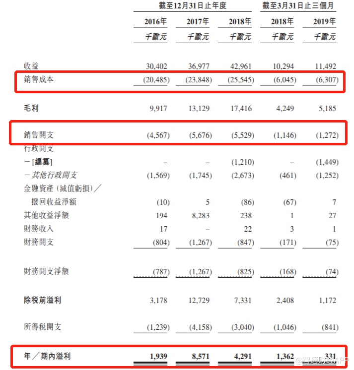 再加上为了提高公司的知名度,德视佳的市场销售开支在近三年已经达到550万欧元以上的水平,这对公司的净利润增长造成了较大压力。今年一季度,公司净利润仅为33.1万欧元,同比下滑75.7%。而在2018年,公司净利润也从上年同期的857.1万欧元降至429.1万欧元,同比下滑49.9%。