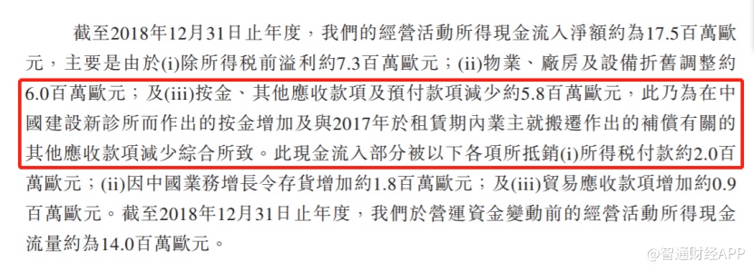 不过,值得注意的是,虽然公司利润情况不算理想,但现金流状况却相对好看一些。招股书显示,2018年公司经营活动现金流净额为1748.5万欧元,远高于当年净利润。对此公司的解释是:在除税前净利润的基础上,公司还存在物业、厂房及设备的折旧调整以及在中国诊所的搬迁补偿款,该补偿款付给公司580万欧元。因此2018年的现金流异常的情况并不具备可持续性。