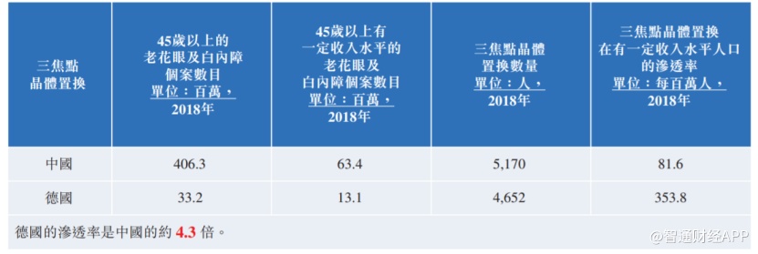 在招股书中,德视佳系统分析了中国近视眼与老花眼和白内障病患市场的相关情况,并将其与德国对比。以三焦点晶体置换手术为例,中国的病患容量理论上高达4.06亿人,而德国仅有3320万;但在渗透率上,德国却是中国的4.3倍。因此,德视佳得出的结论是中国存在一个庞大的未开发市场。