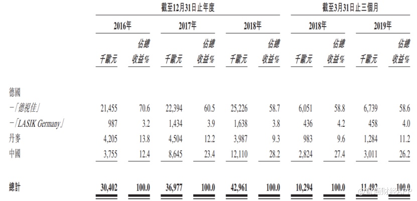 视力矫正服务是德视佳的核心收入业务2016-2018年,该业务收入占比从98.2%提升至98.7%。截至今年3月底,该比重升高至99%,收入达1138.2万欧元,除此之外,公司当期的其他业务收入仅有11万欧元,几乎可以忽略。