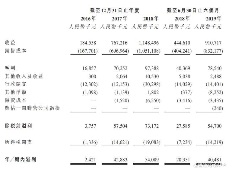 招股书显示,截至2016至2018年度以及2019年6月30日止六个月,该公司收益分别为1.85亿元、7.67亿元、11.48亿元及9.11亿元;毛利分别为1685.7万元、7025.2万元、9738.8万元及7854.0万元;年/期内溢利分别为242.1万元、4288.3万元、5408.9万元及4048.1万元。
