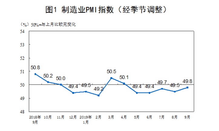 2019年9月份,中国制造业采购经理指数(PMI)为49.8%,比上月回升0.3个百分点。