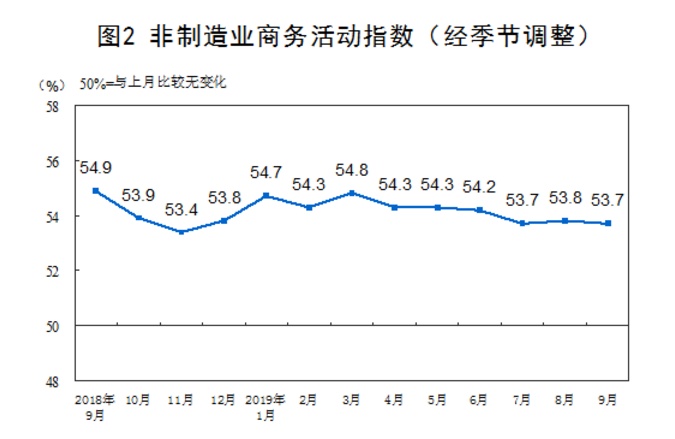 2019年9月份,非制造业商务活动指数为53.7%,略低于上月0.1个百分点,非制造业总体延续平稳扩张态势。