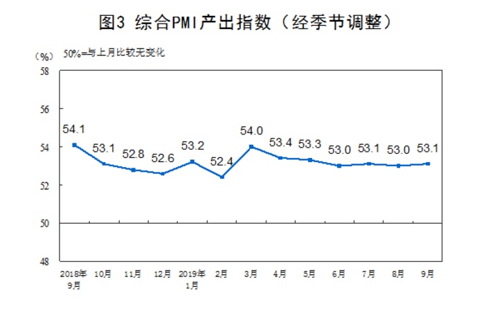 2019年9月份,综合PMI产出指数为53.1%,略高于上月0.1个百分点,表明我国企业生产运营总体平稳。