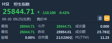 智通财经APP获悉,恒生指数开盘跌110.1点或0.42%,报25844.71点。国企指数跌0.58%,报10089.73点。红筹指数跌0.58%,报4106.19点。大市盘前成交25.76亿港元。