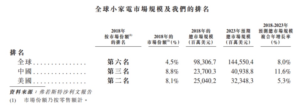 JS环球生活与九阳股份都同样专注于小家电的开发、制造及营销。该公司目前拥有多个备受信赖的市场领先品牌:九阳、Shark、Ninja。根据弗若斯特沙利文的报告,其于2018年在小家电企业中分别排名全球第六和中国第三。
