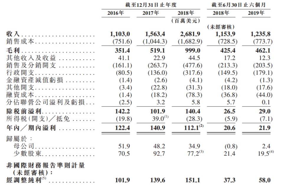 于2016年、2017年、2018年及截至2019年6月30日止六个月,该公司来自前五大客户的收入分别为305.7百万美元、330.8百万美元、703.8百万美元及325.3百万美元,分别占同期总收入的27.7%、21.2%、26.2%及26.3%。