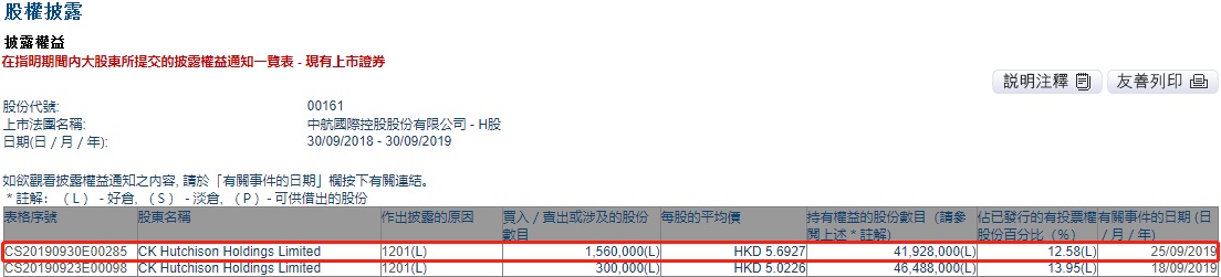 智通财经APP获悉,联交所最新资料显示,9月25日,长和(00001)(CK Hutchison Holdings Limited)减持中航国际(00161)156万股,每股作价5.6927港元,总金额约为888.06万港元。减持后最新持股数目约为4192.8万股,最新持股比例为12.58%。