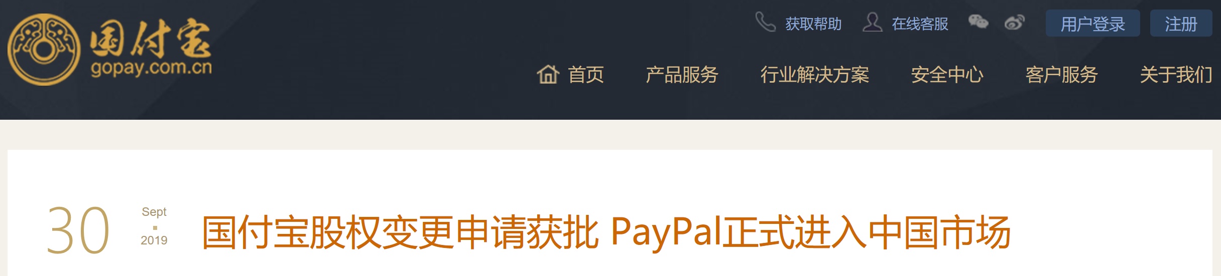 智通财经APP获悉,据支付机构国付宝信息科技有限公司(下称“国付宝”)9月30日官方网站消息,中国人民银行批准国付宝股权变更申请,PayPal通过旗下美银宝信息技术(上海)有限公司收购国付宝70%的股权,成为国付宝实际控制人并进入中国支付服务市场。据悉,多年来,PayPal一直在寻求中国支付牌照,这也是第一家进入我国境内市场的外资支付机构。