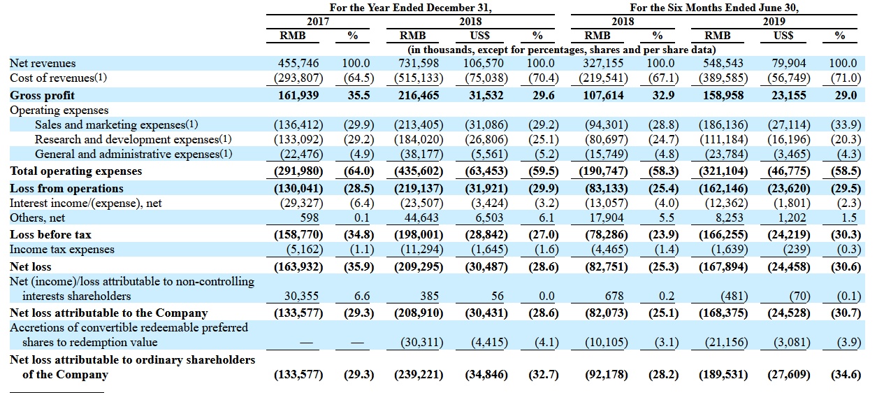 2019年上半年,网易有道总营收5.48亿元人民币,同比增长67.67%,净亏损1.68亿元。其中,在线课程收入由1.6亿增长至2.3亿,同比增长54.3%,从2018年上半年至2019年上半年,有道精品课平均课单价由约人民币508元增至约人民币751元,增长约47.8%;其他学习服务收入为4350万元,同比增长48.4%;有道智能硬件收入4310万,同比增长264.7%。