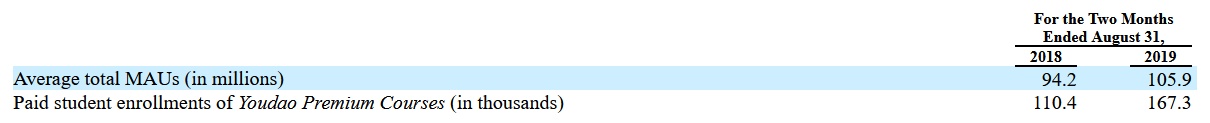 值得注意的是,由于有道加大了销售和营销力度,增加了K12的课程种类,品牌知名度有所提升。K12付费学生注册人数增加了一倍以上,从截至2018年8月31日两个月的2.47万增长到截至2019年8月31日两个月的7.57万。