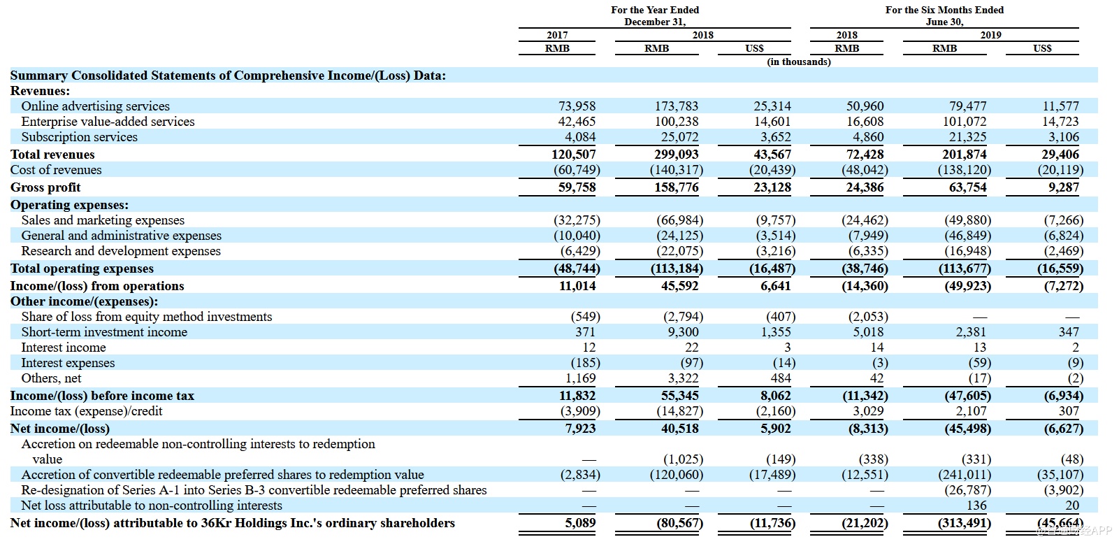 据招股书显示,该公司2018年营收为人民币2.991亿元(约合4360万美元),与2017年的人民币1.205亿元相比增长148.2%。在截至2019年6月30日的6个月,36氪的营收为人民币2.019亿元(约合2940万美元),与2018年同期的人民币7240万元相比增长178.7%。