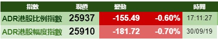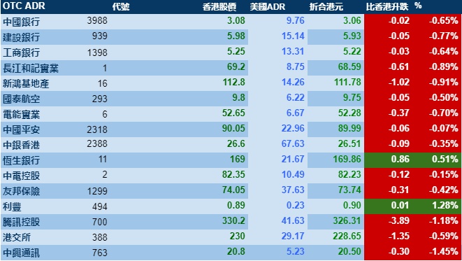 智通财经APP获悉,周一美股出现不同程度上涨,但港股ADR指数却走软,按比例计算,收报25731点,跌222.57点或0.86%。大型蓝筹集体下跌,汇丰控股收报60元,较港收市跌0.4元;腾讯控股收报326.31元,较港收市跌3.89元。