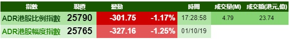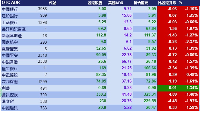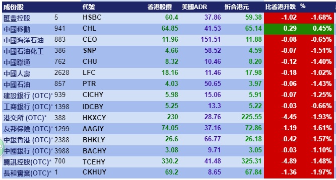智通财经APP获悉,周二美股出现不同程度下跌,港股ADR指数跟跌,按比例计算,收报25790点,跌301.75点或1.17%。大型蓝筹集体下跌,汇丰控股收报59.38元,较港收市跌1.02元;腾讯控股收报325.31元,较港收市跌4.89元。