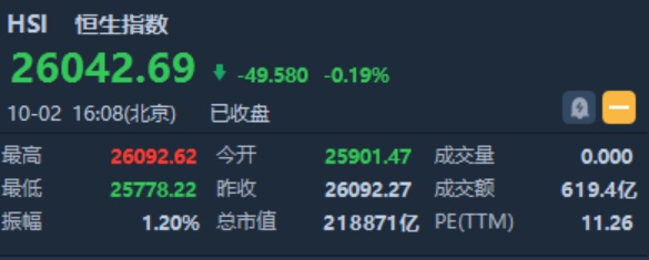 智通财经APP获悉,恒指早盘低开190.8点或0.73%,报25901.47点。截至收盘,恒生指数跌49.58点或0.19%,报26042.69点,全日成交额达619.45亿。国企指数跌0.18%,报10182.97点,红筹指数跌0.01%,报4147.62点。